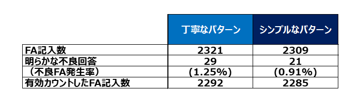 むしろ、明らかな不良回答はシンプルなパターンの方がやや少ない結果でした。