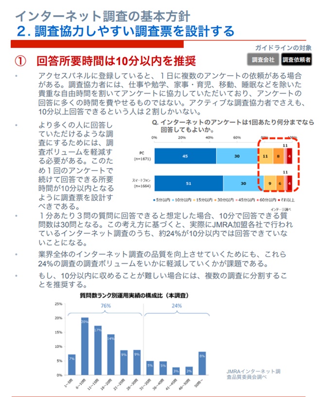 弊社も加盟しているJMRA(一般社団法人 日本マーケティング・リサーチ協会)では、ここ数年インターネット調査ガイドラインを作成し、様々な心掛けを提唱しています。