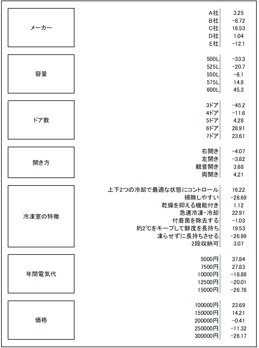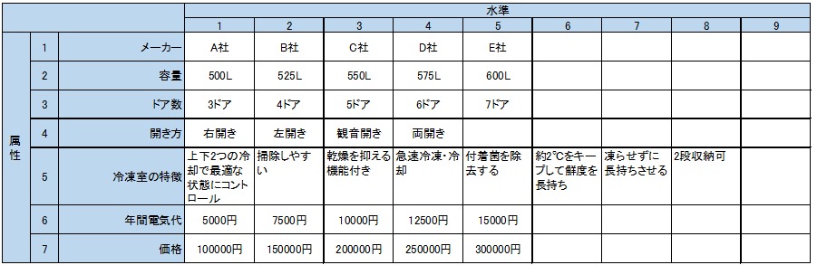 コンジョイント分析は、属性/水準というものを用意し、各水準を組み合わせて、それぞれについて評価する事で、結果を得る手法です。例えば冷蔵庫を例に取ると、以下のような属性・水準表を作成します。