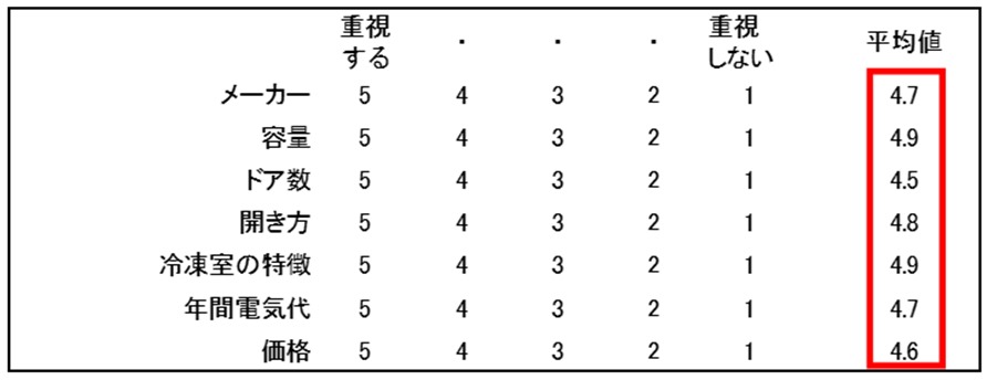 上記の「1」について、通常の調査の場合、以下のように重視度を聴取すると平均値が似通ってしまい、結果的に何が重要なのかが分からない場合があります。