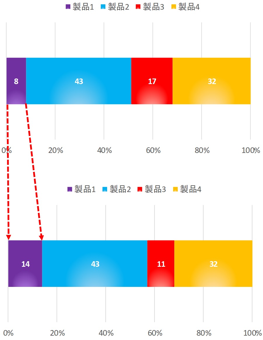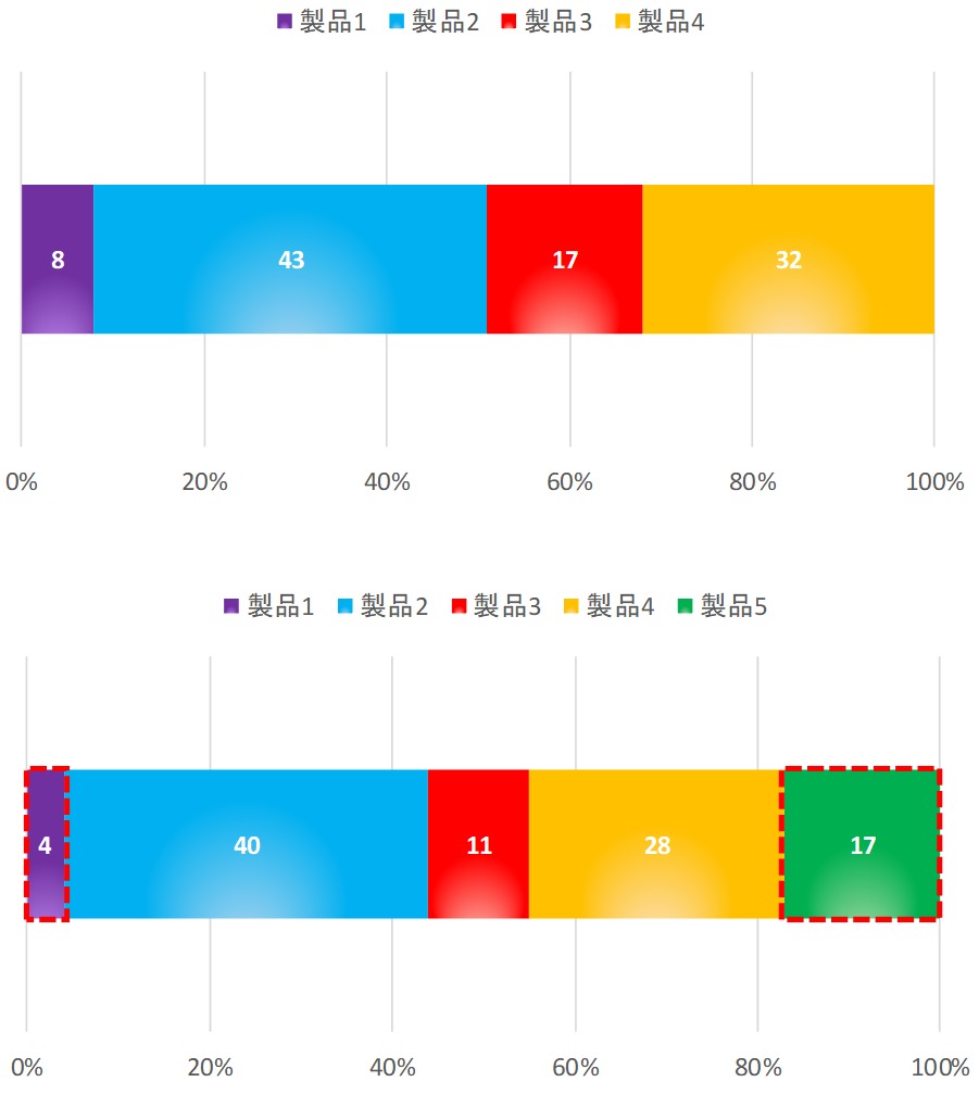 「C社」が製品5を投入した事によって、17%のマインドシェアを得る事ができましたが、カニバリが起きてしまい、自社の製品1のマインドシェアは4%に減ってしまいました。しかし、製品5を投入する前と比べると、自社製品のマインドシェアは8→21%に増えた事になるので、製品5の市場への投入は正解だった事がわかります。