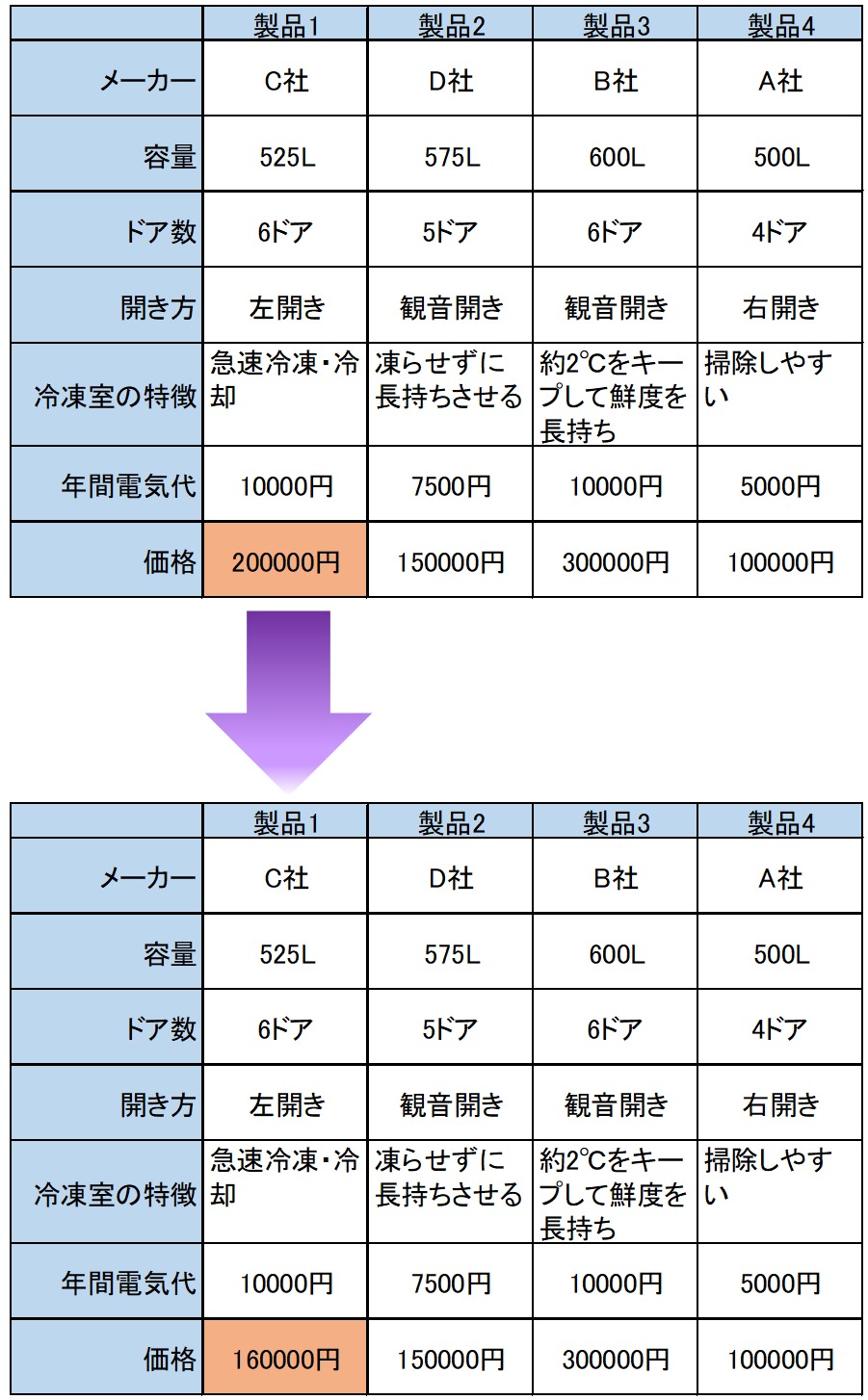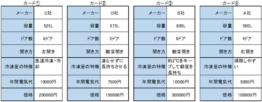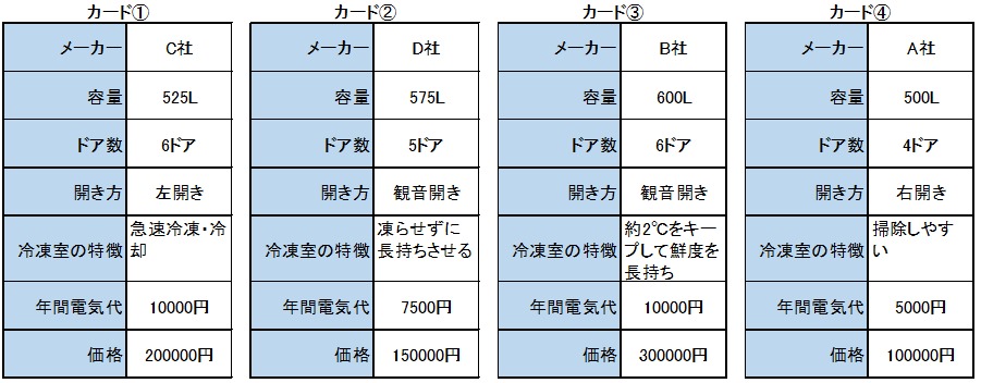 「カード③は容量も大きいし、冷凍室の特徴も欲しい機能だし、ドア数も多くて良いんだけど、価格がねぇ・・・」