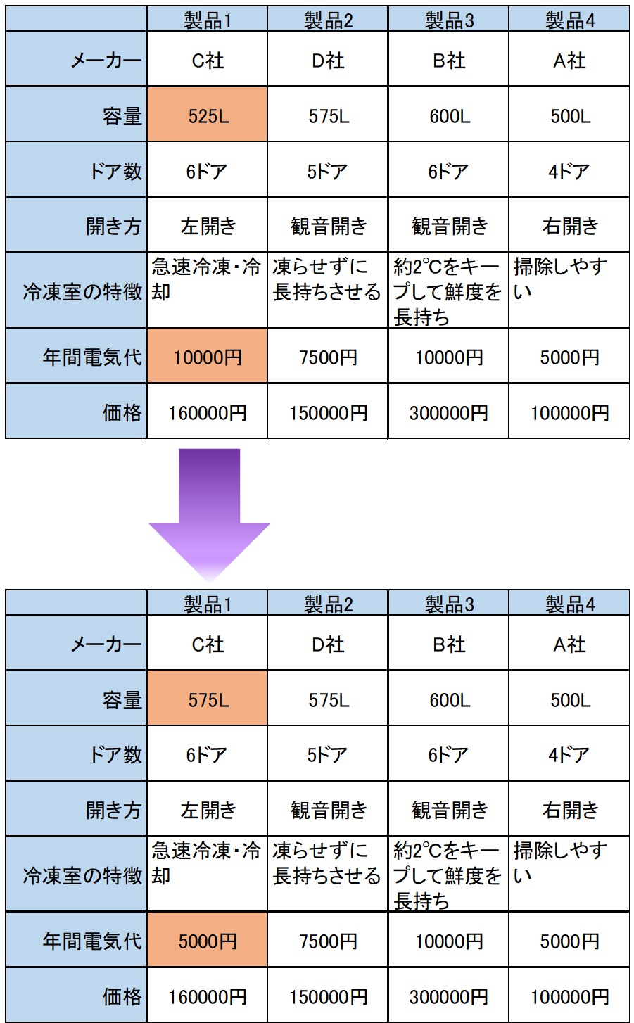 更に、自社製品に改良を加えてシミュレーションします。「容量」広くし「年間電気代」も変更してみます。