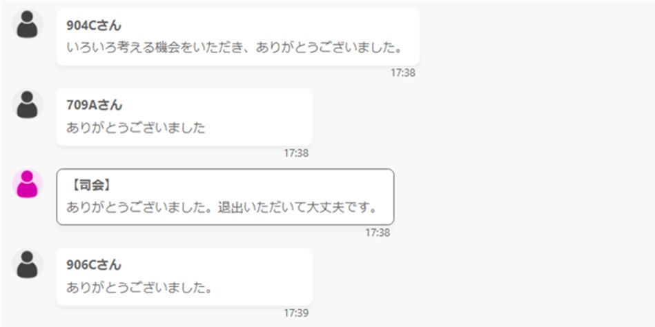 もちろんモデレーターが、参加者の皆さんから、できる限り平等に意見を聴けるようハンドリングしますが、そうは言っても”発言がポンポン出てくる方“と”じっくり発言内容を考えてから話し出す方“が同じグループにいらっしゃる場合、オフラインよりも一人の方がずっと話している状況になりやすいことがあるようです。