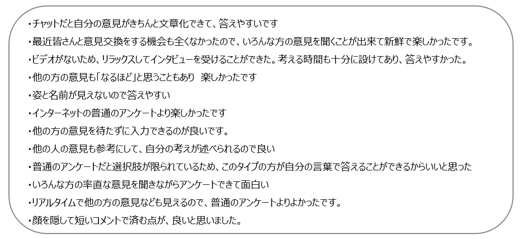 ここで、弊社の「オンラインチャットインタビュー」の自主調査へ参加された方の感想を一部ご紹介します。