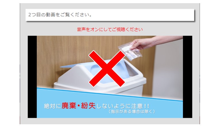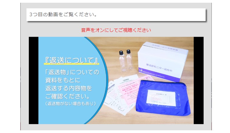 このシステムでは、最初に、内容物・注意事項の確認動画、テスト品の取り扱い・守秘義務の動画、返送の動画、を音と映像でわかりやすくお伝えし、間違った使い方や誤廃棄・紛失を防止しています。