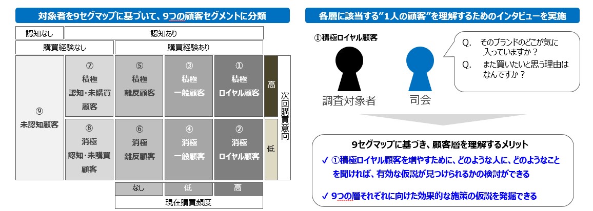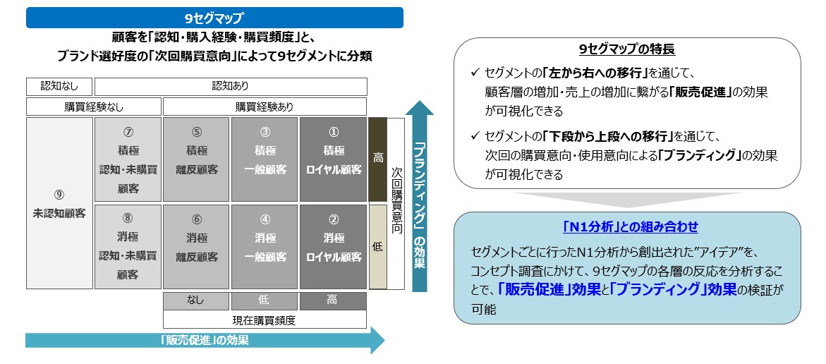 顧客を「認知・購入経験・購買頻度・次回購買意向」で9つのセグメントに分類することで、