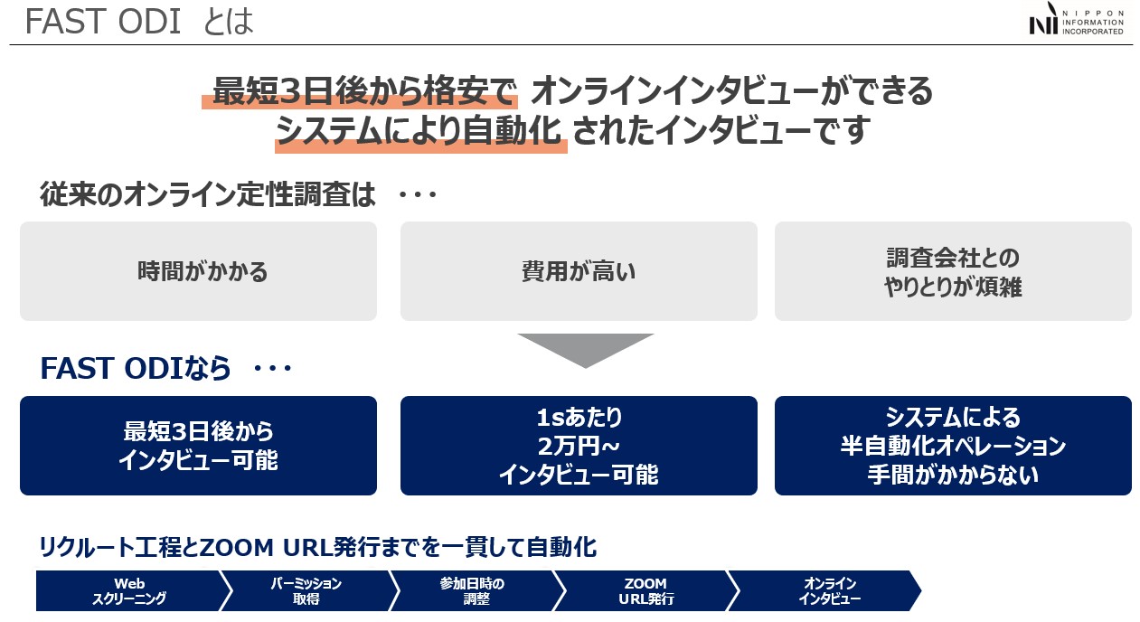 まずはFAST ODIの特長としては、その名の通り、【FAST=早く】【ODI=オンラインデプスインタビュー】が出来るツールです。