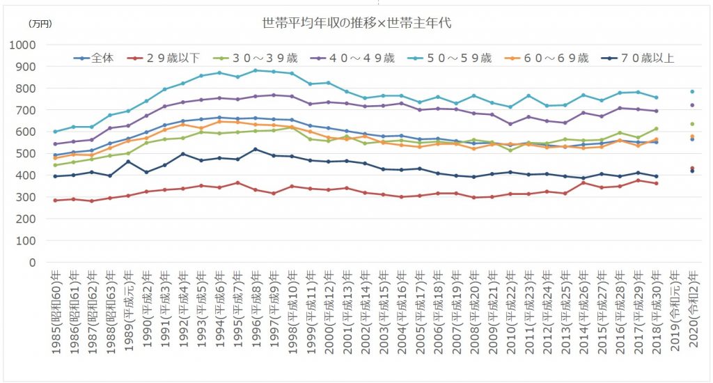 こちらは1985年~2020年までの世帯年収の推移を世帯主年代別にみたものです。
