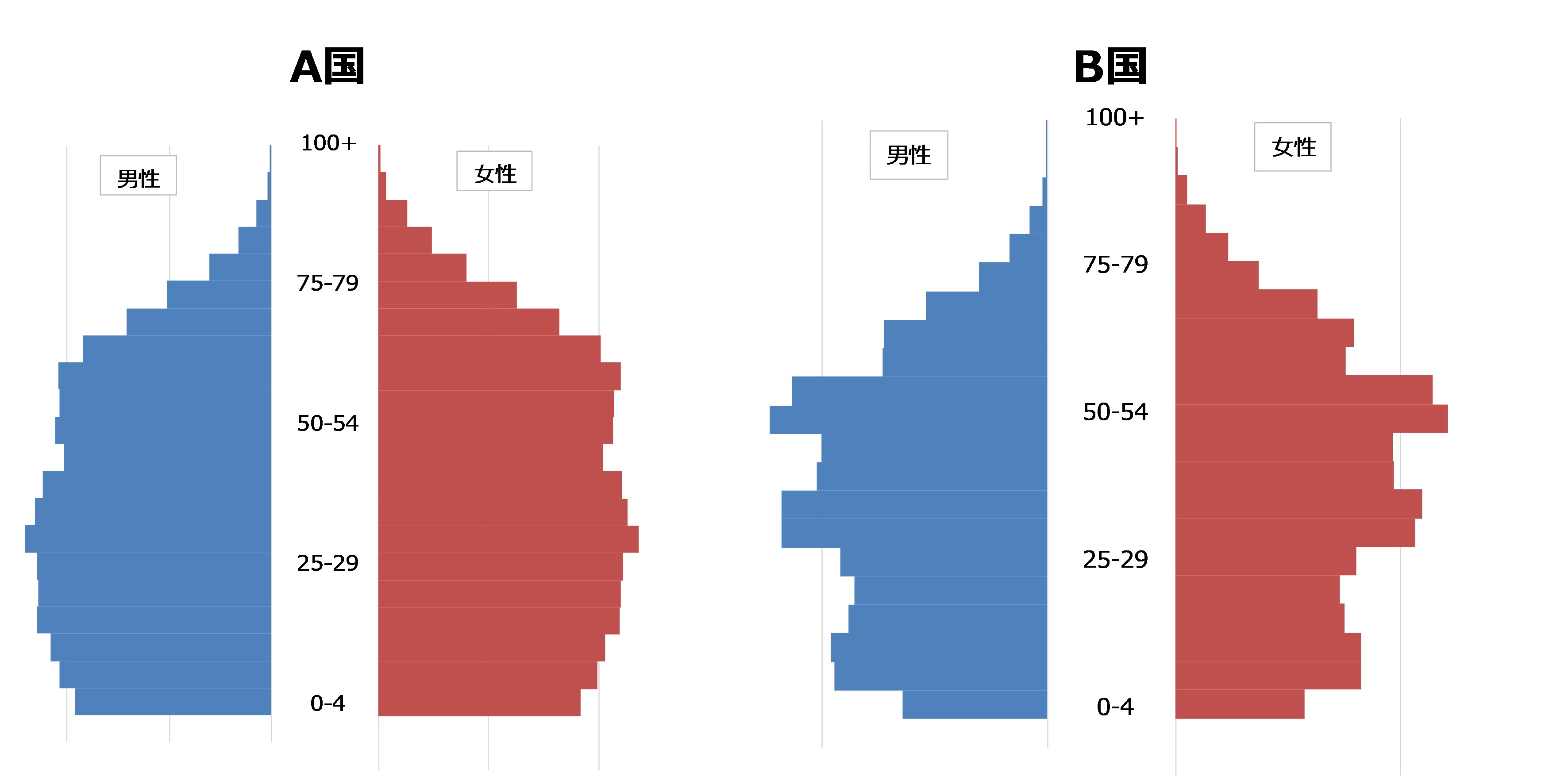 こちらは2023年の人口データから作成したA国とB国の人口ピラミッドです。