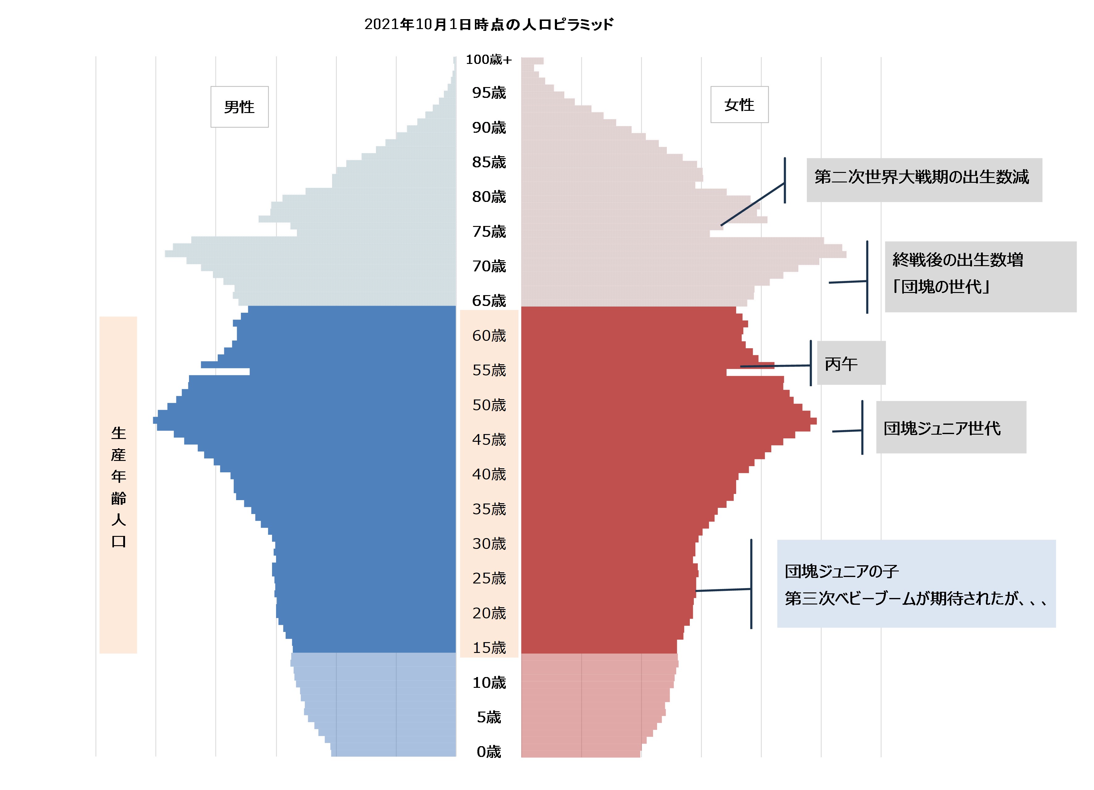 下図は2021年10月1日現在の日本の人口ピラミッドです。
