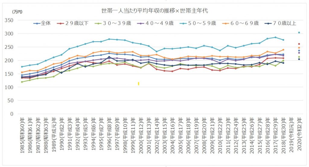 これは「世帯一人当たり平均年収の推移」です。「50-59歳」はこの30年突出はしていますが、内容は変わっています。