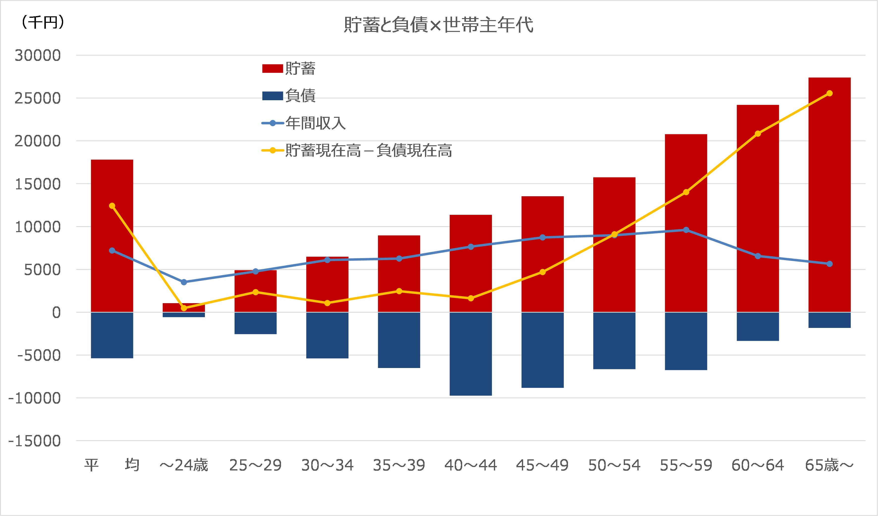 負債は住宅ローンなどを抱える年代と重なるので、30代後半から40代に増えています。