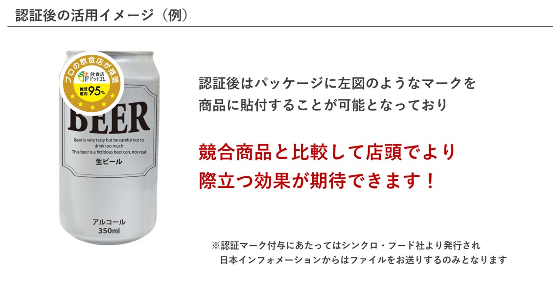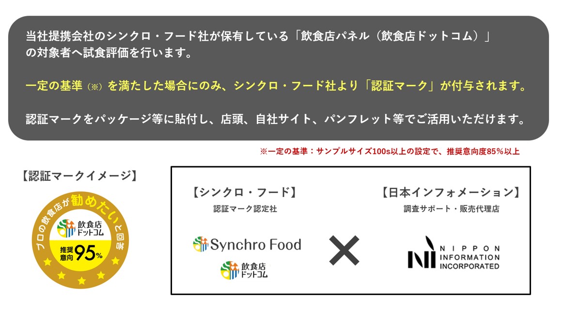 簡単にご説明すると、飲食店関係者にHUT(ホーム・ユース・テスト)で対象製品の試食・試飲評価を行ってもらい、“推奨意向”の設問において一定の基準を満たした場合に、『認証マーク』を付与するという調査です。