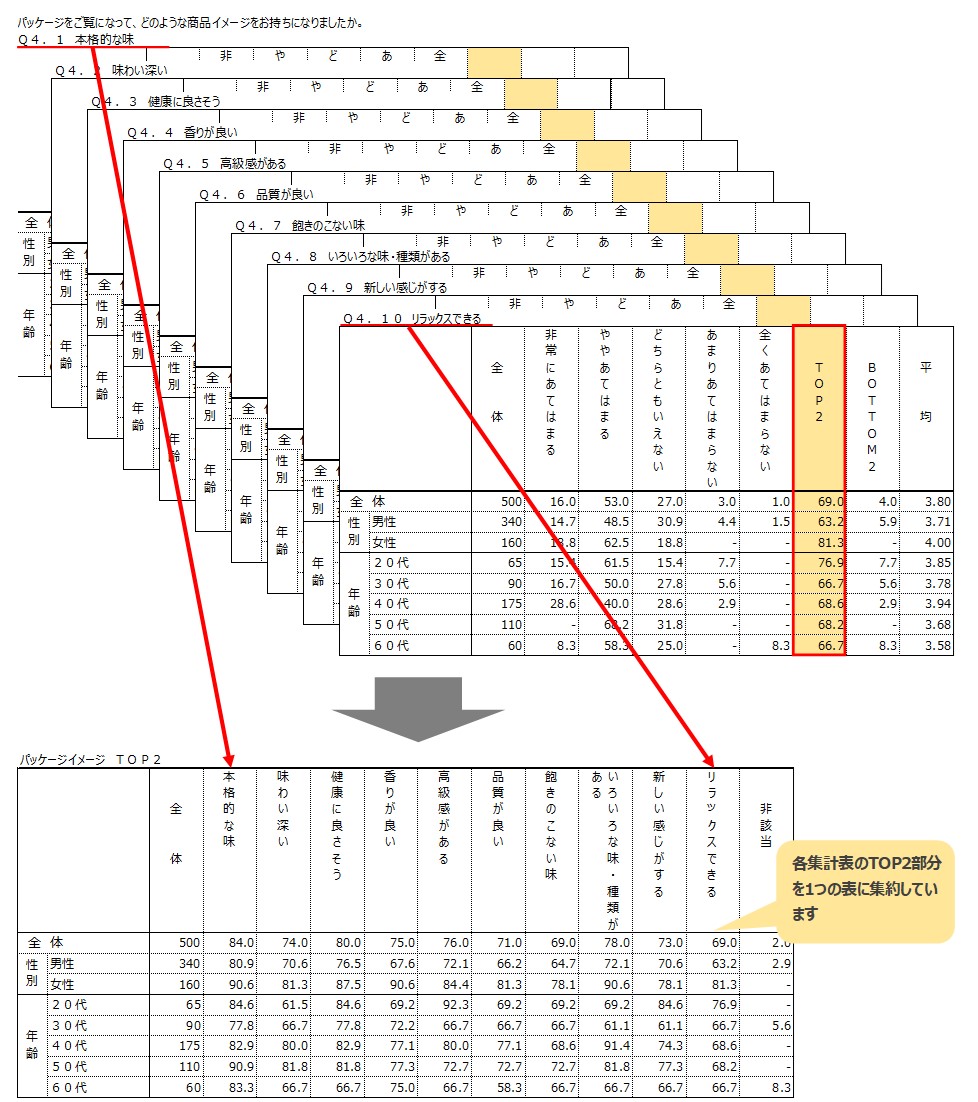 「縦マルチ表」とは、簡単にいうと複数の設問の集計表の一部のデータを1つの集計表に集約するという考え方です。