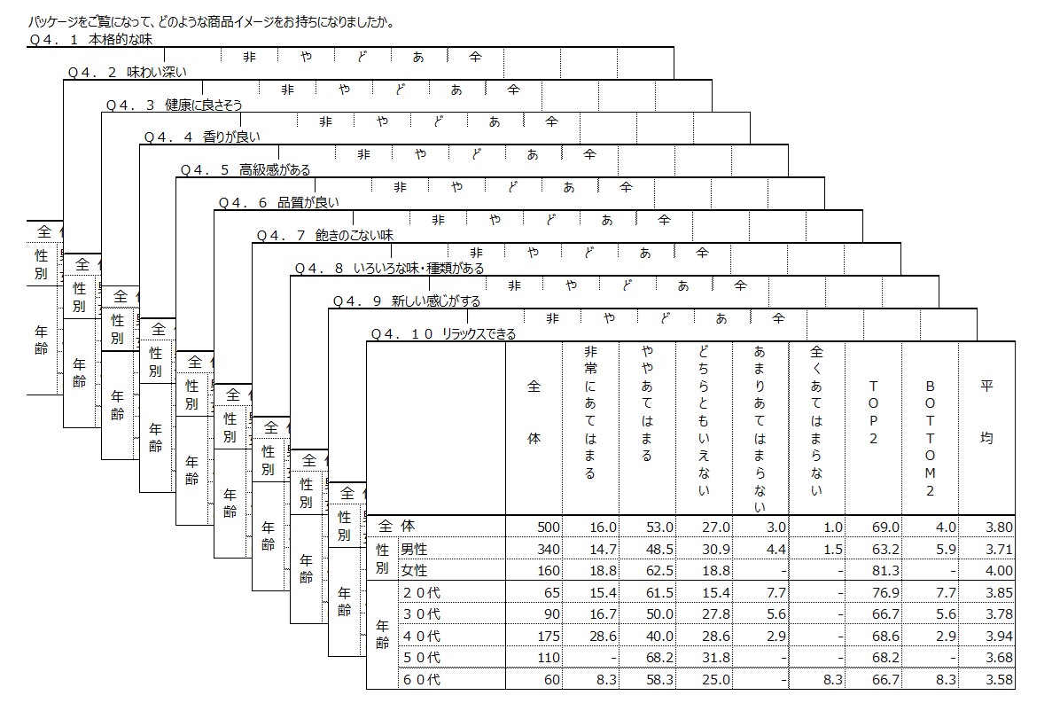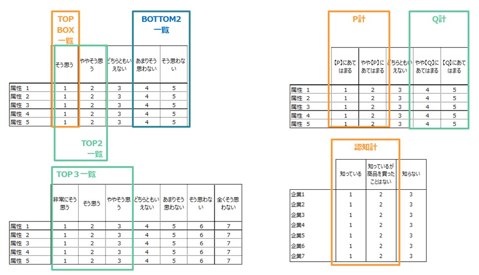 TOPBOXやTOP2BOXの他、BOTTOM評価にもデータがある程度分布している場合、 TOP評価だけ「縦マルチ表」を作成してしまうと、BOTTOM評価を見落としてしまいます。 - 回答者数(n)が同じであること