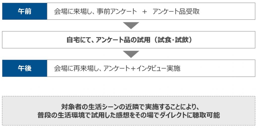 拠点会場での2回来場調査であれば、普段の生活の中で自然に飲用した上でその日のうちにデータを回収できますので、まさにCLTとHUTの良いところ取りといえます。