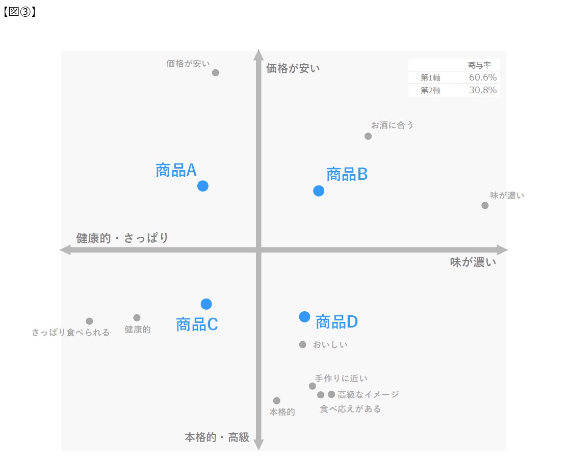 このように、商品A~Dを相対的に見たときにどのようなポジションニングにあるかを確認することができます。