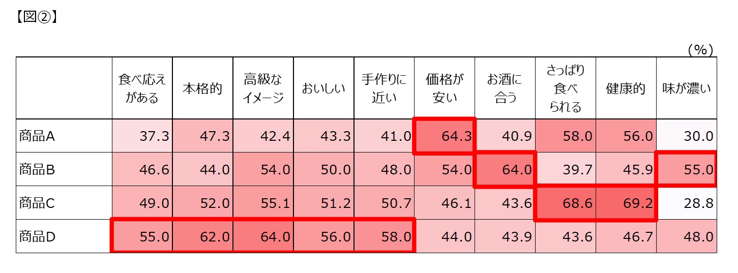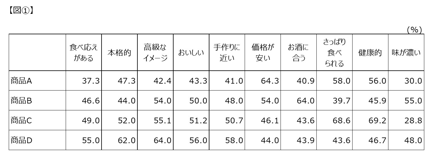 商品D:「本格的」「食べ応えがある」「おいしい」等といったイメージが相対的に強い