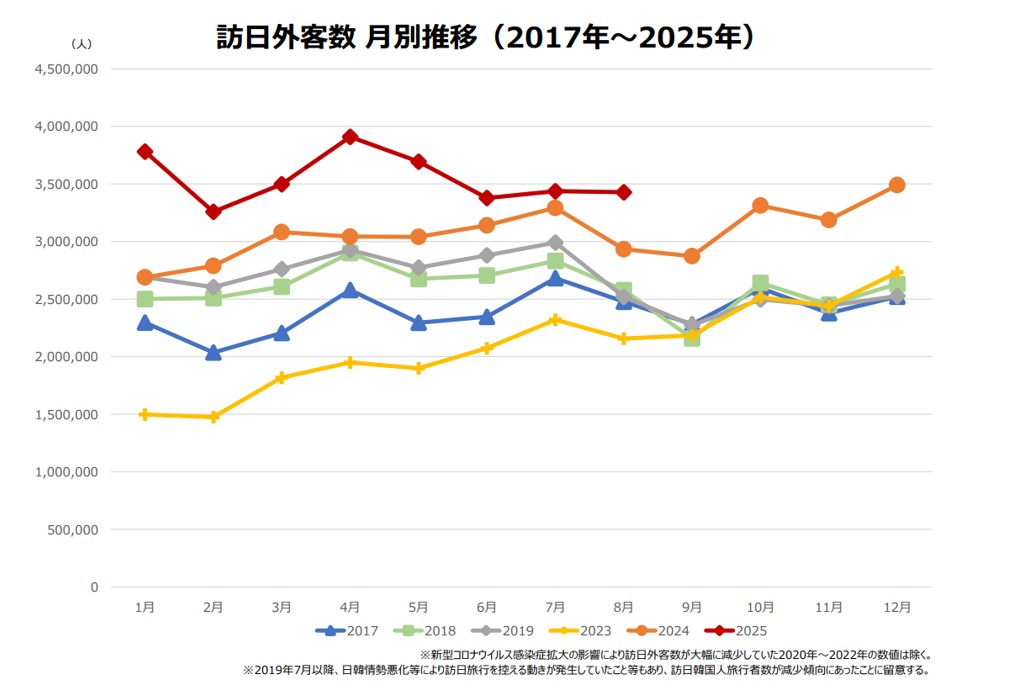 2025年8月、日本を訪れた外国人観光客数は342万8,000人に達し、前年同月比16.9%増という大幅な伸びを記録しました。