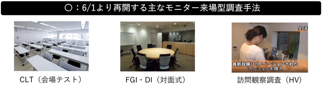 平素より、日本インフォメーションのサービスをご利用いただきまして誠にありがとうございます。 新型コロナウイルス感染拡大の抑制ならびに、あらゆる関係者の皆様の安全確保を考慮し、実施を中止していた対面型リサーチ(CLT、対面型FGI、DIなど)の対応を、2020年6月1日(月)より再開いたします。 モニター来場型調査における、関係者及び調査参加者の感染リスク軽減策として、以下の対策を原則講じます。業界でCLT実施数トップクラスの日本インフォメーションが様々な視点から検討を重ねた結果ですので実施再開の参考にしていただけますと幸いです。 ※新型コロナウイルスの感染拡大状況や政府、各自治体の方針が変更される場合は、随時見直しします