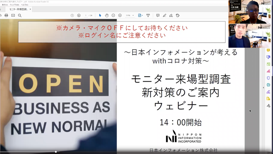 2020年6月吉日、当社主催のオンラインセミナー「~日本インフォメーションが考えるwithコロナ対策~ モニター来場型調査 新対策のご案内」を開催しました。当日は多くの方にご視聴いただき、改めましてお礼申し上げます。