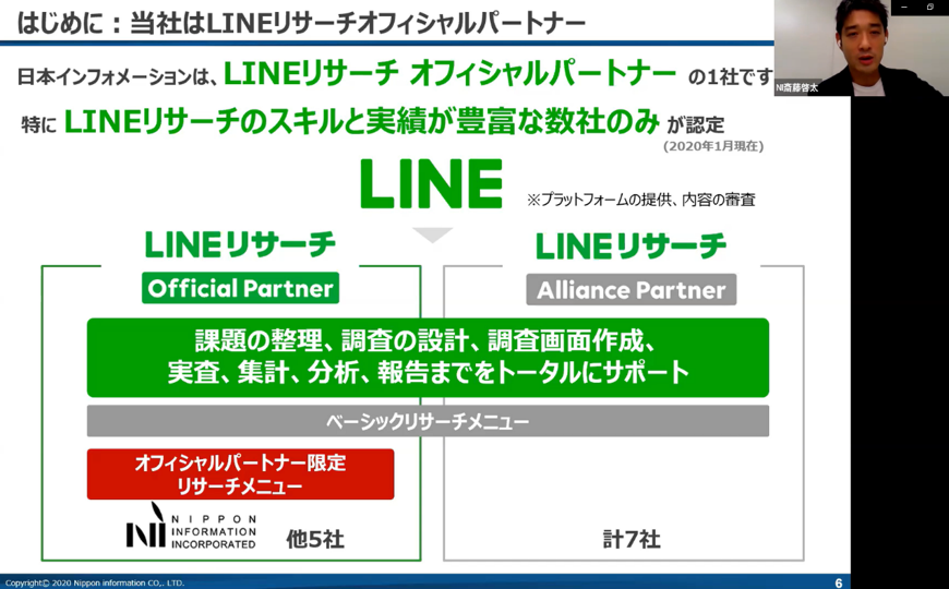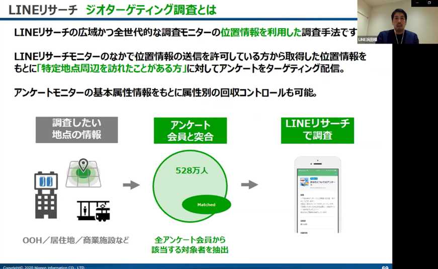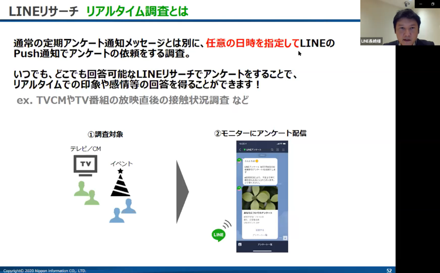 2020年7月吉日、当社主催のセミナー「LINEのオリジナルメニューを活用した新たなスマホリサーチ LINEリサーチ オンラインセミナー」を開催しました。当日は多くの方にご来場いただき、改めましてお礼申し上げます。   オンラインセミナーでは、当社代表:斎藤啓太より「LINEリサーチ」の特徴や事例についてご説明させていただきました。   加えて、LINEリサーチのプロフェッショナル「オフィシャルパートナー」しかご提供できない様々なオリジナルリサーチメニューの詳細を、LINE株式会社浜田智行様、長崎恵祐様よりご紹介いただきました。   <オフィシャルパートナー限定リサーチメニュー> ・行動ログ調査 ・広告ID連携調査 ・リアルタイム調査 ・写真調査 ・生活圏パネル調査 ・ジオターゲティング調査 ・オープン型調査   ※発表内容についてのお問い合わせは営業担当へ、またはHP問い合わせフォームよりお願いします。https://www-n-info-co-jp-dev.app-gohako.com/inquiry/ ご紹介したスマートフォンを活用した新たなリサーチメニューについて、是非ご活用をご検討いただけますと幸いです。