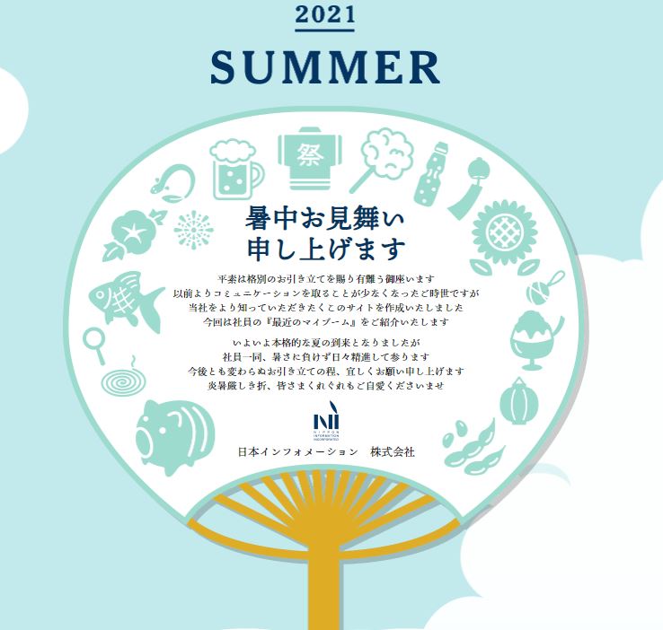 暑中お見舞い申し上げます。   平素は格別のお引き立てを賜り有難う御座います。   以前よりコミュニケーションを取ることが少なくなったご時世ですが 当社をより知っていただきたくこのサイトを作成いたしました。 今回は社員の『最近のマイブーム』をご紹介いたします。   以下URLより、是非ご覧ください!