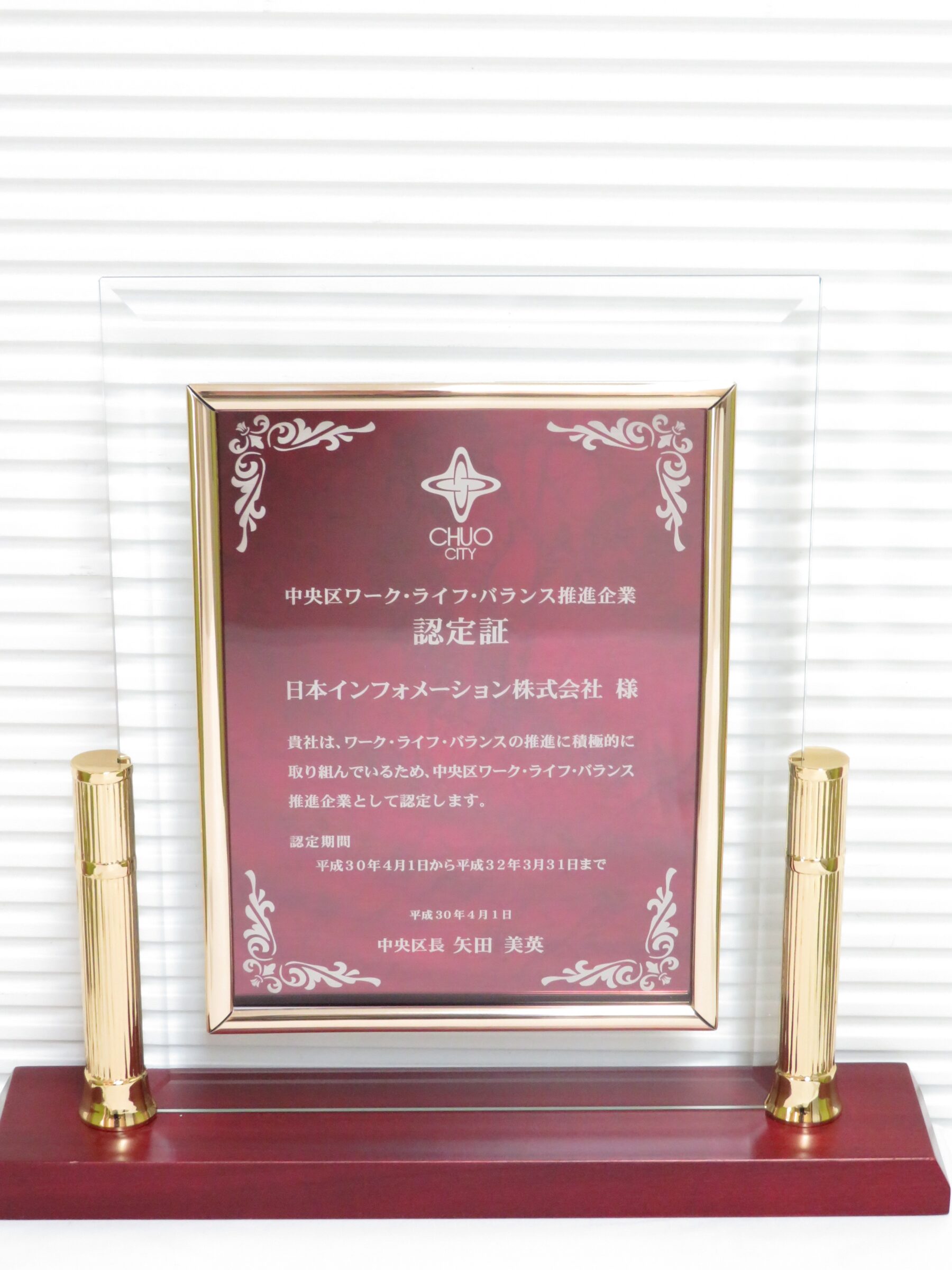 弊社でのノー残業デーの取り組みや有給休暇取得の促進、時短勤務制度の導入など、働きやすい会社を目指した様々な取り組みが認められ、この度、東京都中央区のワーク・ライフ・バランス推進企業に認定されました。