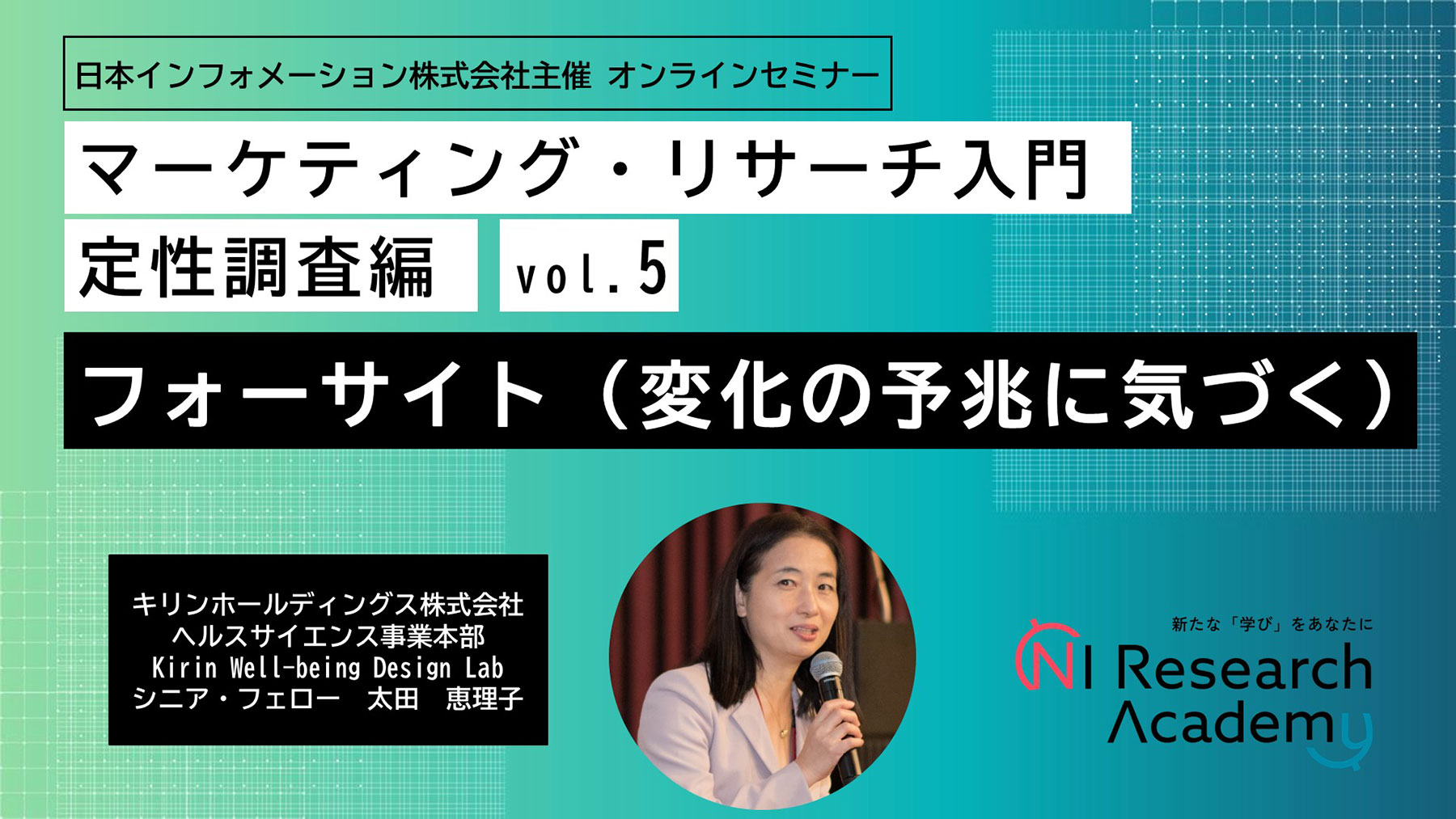 定性調査編は、2007年の設立以来、「Kirin Well-being Design Lab」(※2020年4月に前身のキリン食生活文化研究所より組織名称変更)にて、食と健康の領域を軸として、生活者のライフスタイル研究や有識者へのインタビュー、変化の予兆の探索を通じて、未来洞察を手掛けられてきた太田様を講師にお迎えします。