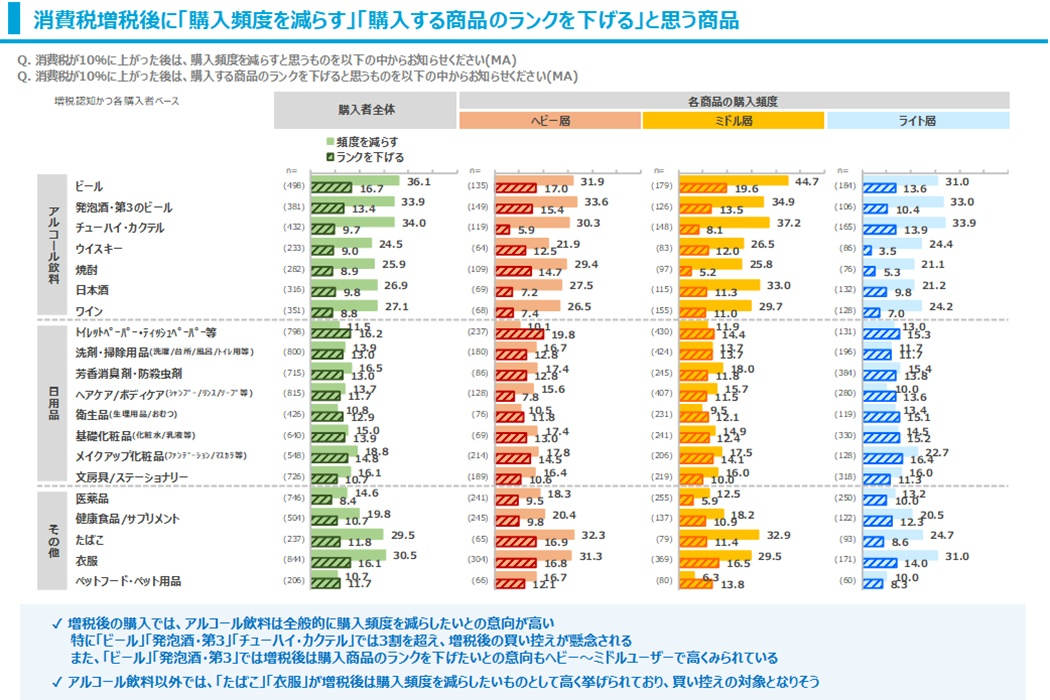今回の増税前に買いだめしておきたい商品についての質問では、「トイレットペーパー」「洗剤」などの生活必需品に加えて「ビール」「たばこ」などの嗜好品でも高い結果でした。これらの商品を中心に増税前の買いだめ購入があらわれやすそうです。