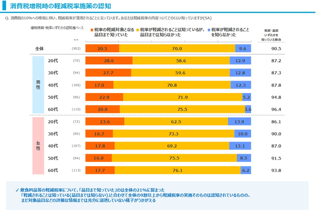 軽減税率が導入されること自体は9割の人が知っていますが、品目などの内容まで理解しているのはまだ2割に留まっています。