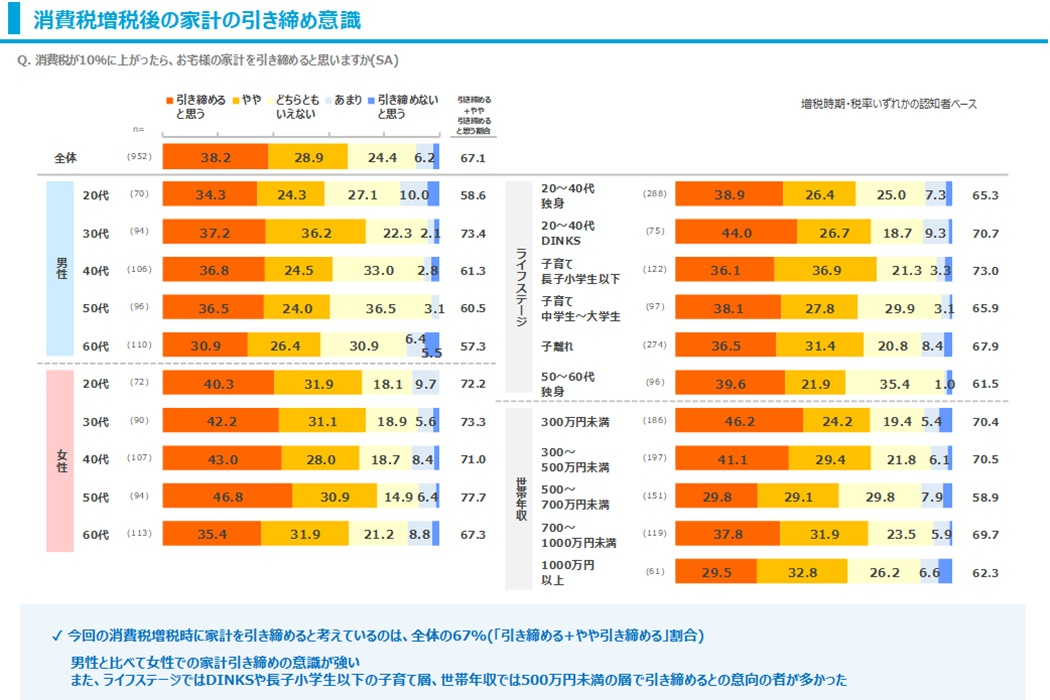 さらに、前回の消費税8%の増税時と比べてどちらの方が家計を引き締めるか聞いてみたところ、全体の5割が今回の方が引き締めると答えています。残り4割はどちらともいえないとまだ態度を決めかねている状況です。