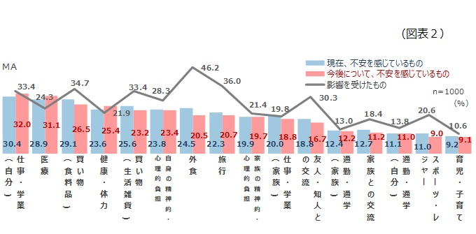 現在の不安は、「仕事・学業(自分自身)」30.4%、「買い物(食料品)」29.1%、「医療」28.9%。今後の不安は、「仕事・学業(自分自身)」32.0%、「医療」31.1%、「買い物(食料品)」26.5%がそれぞれ上位3項目に挙がりました。「仕事・学業(自分自身)」への不安が、現在・今後ともに最も多い結果となりました。(図表2)