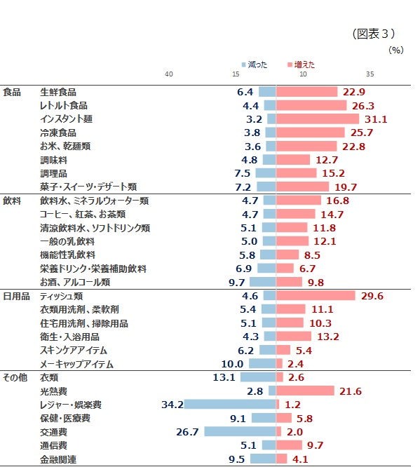 一方、支出が減った項目は、「レジャー・娯楽費」が34.2%で最も高く、次いで「交通費」が26.7%となっています。(図表3)