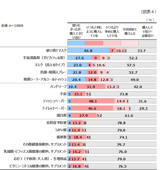 買いたかったが、購入できていないもので最も多かったのは、「使い捨てマスク」(全体46.8%、女性52.3%)で他の商品と比べて際立っています。2番目以降は、「手指消毒剤」27.6%、「マスク(洗えるタイプ)」23.0%と続いています。