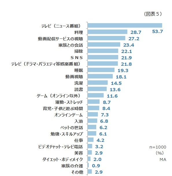 2番目以降について、「料理」28.7%、「動画配信サービスの視聴」27.2%が上位となりました。(図表5)