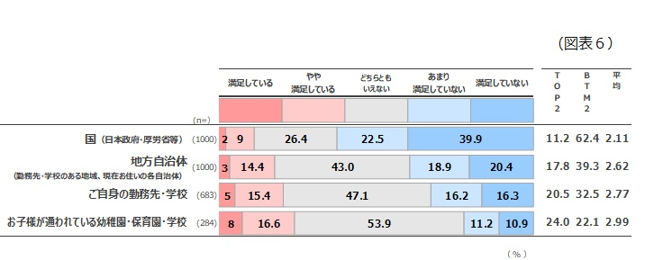 「幼稚園・保育園・学校」の対応については、満足の合計が不満の合計を1.9pt僅かに上回るものの、満足(TOP2)は25%を下回っています。評価が得られているとは言い難い結果となりました。(図表6)