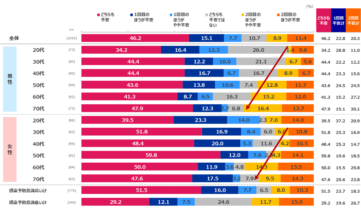 全体では「どちらも不安」が46.2%と最も多い。男女とも年代が上がるほど「2回目(今回)の方が不安」と感じている傾向。