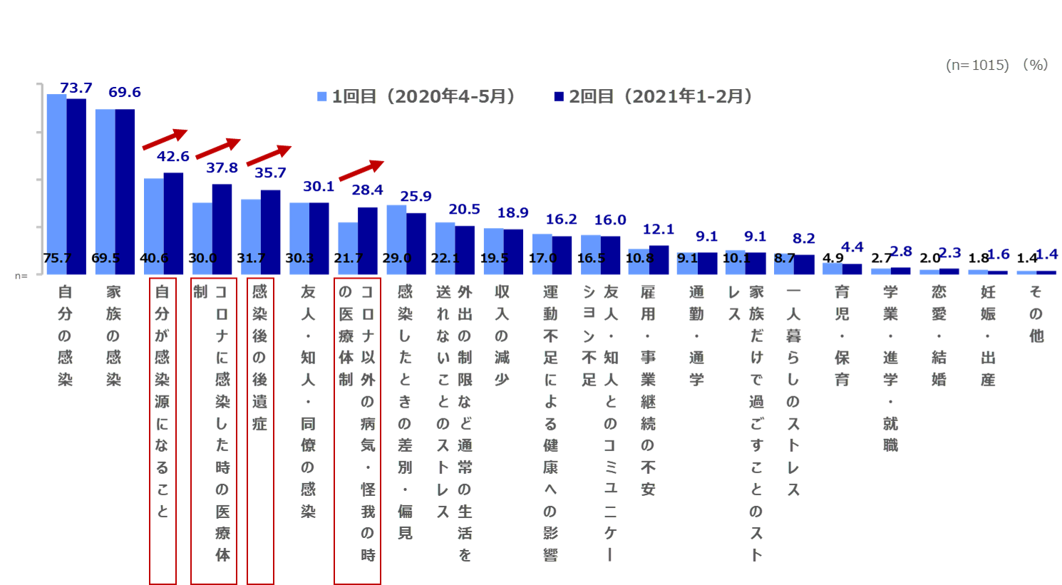 1回目と比較して2回目でも「自分の感染」が最も多い。2回目の方が医療体制や後遺症への不安が増加。