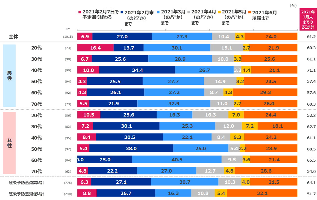 ■全体では、「2021年3月まで延長」が27.3%と最も多く、「2021年2月末まで延長」が27.0%、「2021年6月以降まで延長」が24.0%と続く。最も短い「2021年2月7日で予定通り」は男性20代で16.4%、女性20代で10.5%と男女とも20代が最も多く、一方で最も長い「2021年6月以降まで延長」は男性60代で29.3%、女性70代で28.6%が最も多く、若年層はやや楽観的、高齢層はやや慎重な見方をしている傾向。(図表6)