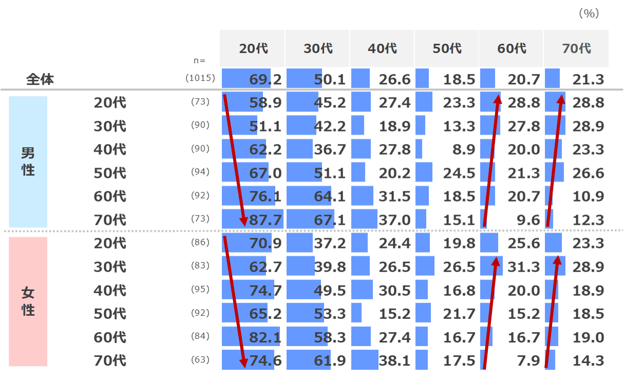 ■全体で最も多いのは「20代」で69.2%、「30代」50.1%、40代「26.6%」と続く。全体では「20代」が最も多いが、男性20代は「20代」の回答が58.9%と全体と比較して▲10.3ptsと最も少ない。特に男性において、年代があがるほど20・30代の若年層が行動自粛できていないと思っており、一方で、年代が下がるほど60・70代の高齢層が行動自粛できていないと思っている傾向にある。(図表7)