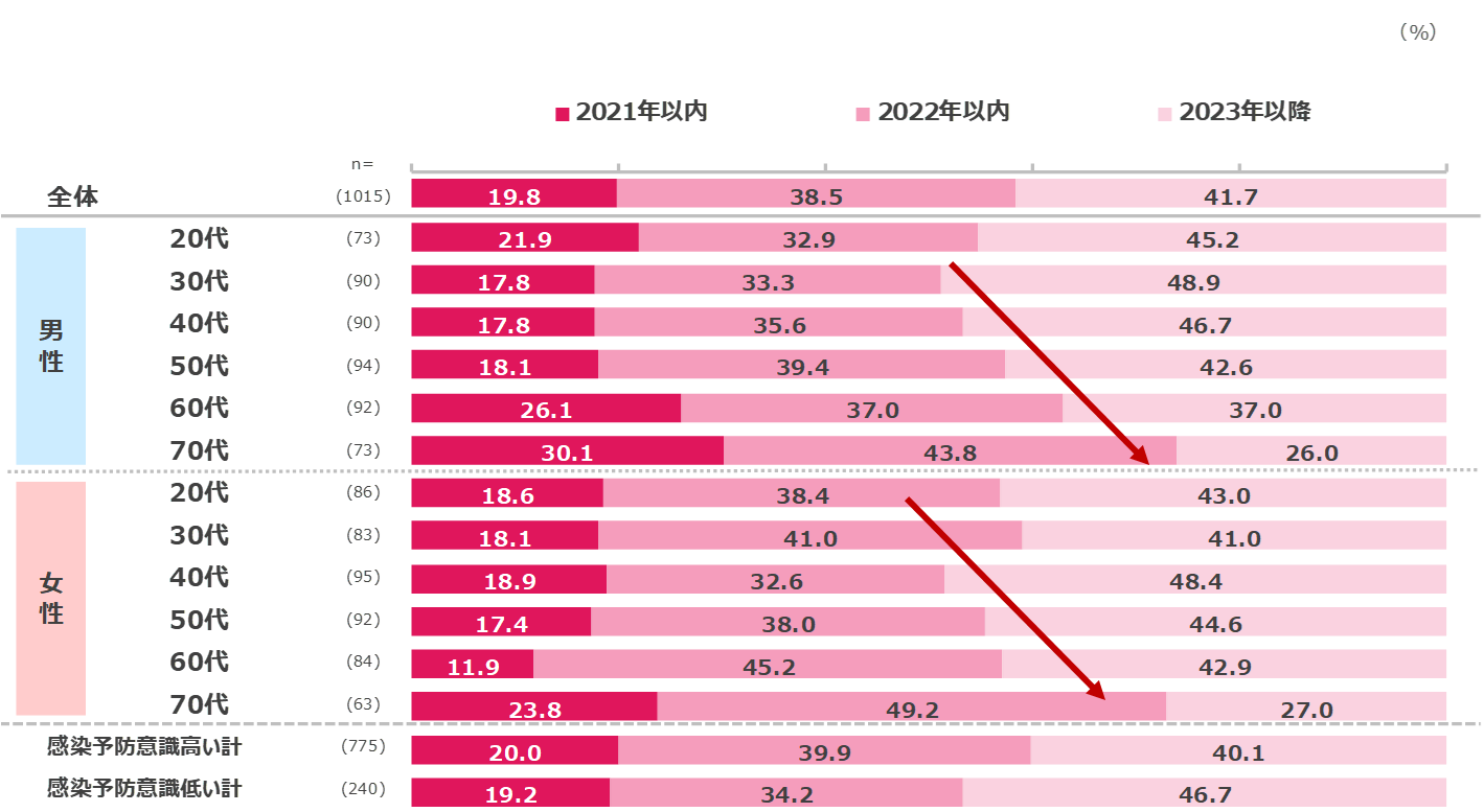 全性年代で「2023年以降」が4割と最も多く、回復には長期的な時間がかかるとの悲観的な見方が多い。