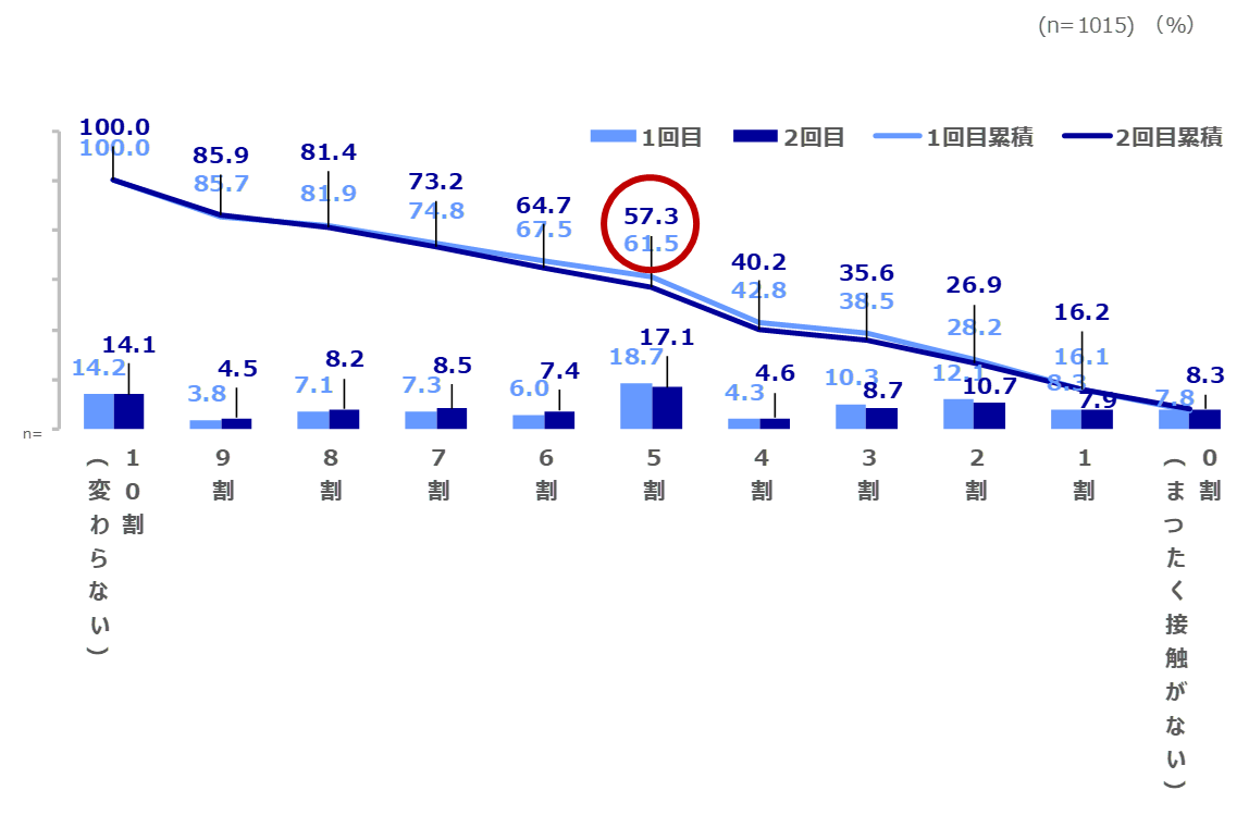 ・ 2回目の緊急事態宣言では、半数以上は「5割以下」しか人との接触を削減できていない