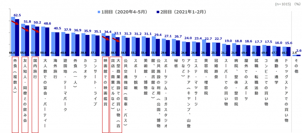 1回目と比較し、総じて2回目の自粛行動は減少。1・2回目とも外食や飲み会、旅行の自粛が上位にあがる。