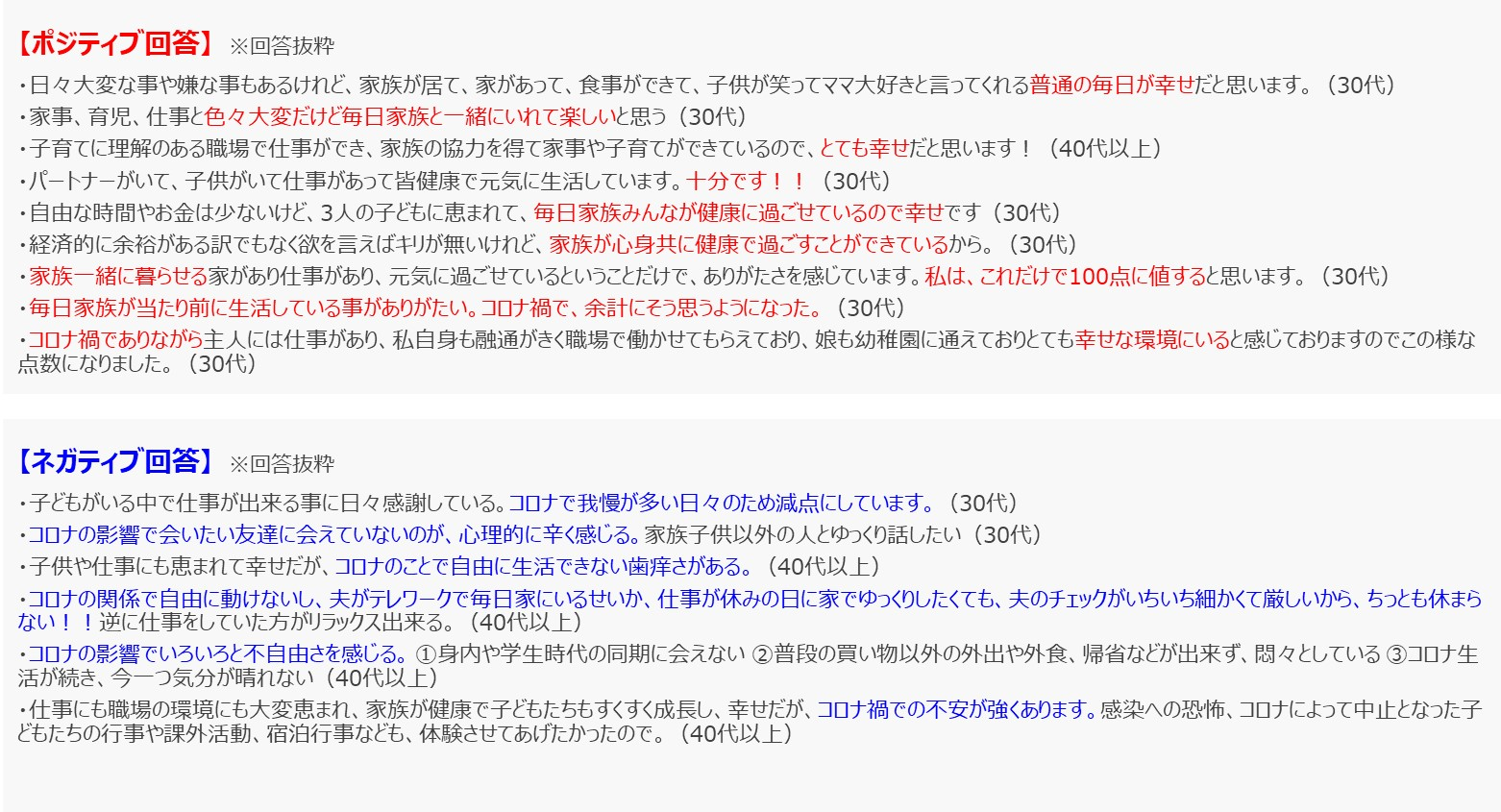 ■以下にその一部を抜粋してご紹介します。ポジティブ回答では「普通の毎日や当たり前の生活が幸せ」「家族が一緒に居られること」「家族が健康」といった内容が多く、ママスクママは忙しい毎日でも十分に幸福を感じているようです。ネガティブ回答は、コロナによる不便さ、不満、不安が多く見られました。また、「仕事ができる環境」「仕事に恵まれている」といった仕事ができることに幸福・感謝の気持ちを感じているようです。(図表5)