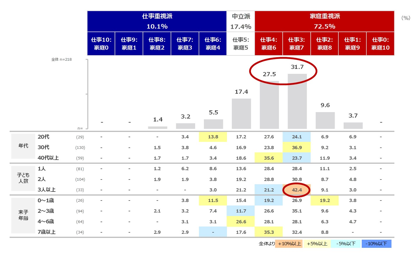 ■特に、子ども人数が3人以上いるママは「仕事3:家庭7」の割合が全体と比較して10ポイント以上高く、やはり子どもの人数が多いほど、家庭の割合がやや増えるようです。(図表1)