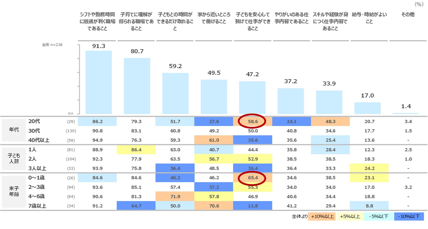 ■「子どもを安心して預けて仕事ができる」は、20代や末子年齢0~1歳ママで全体と比較して10ポイント以上高くなっています。ママスクエアの「子どものそばで働ける」ことは、小さい子どものママほど大きなメリットを感じています。(図表2)