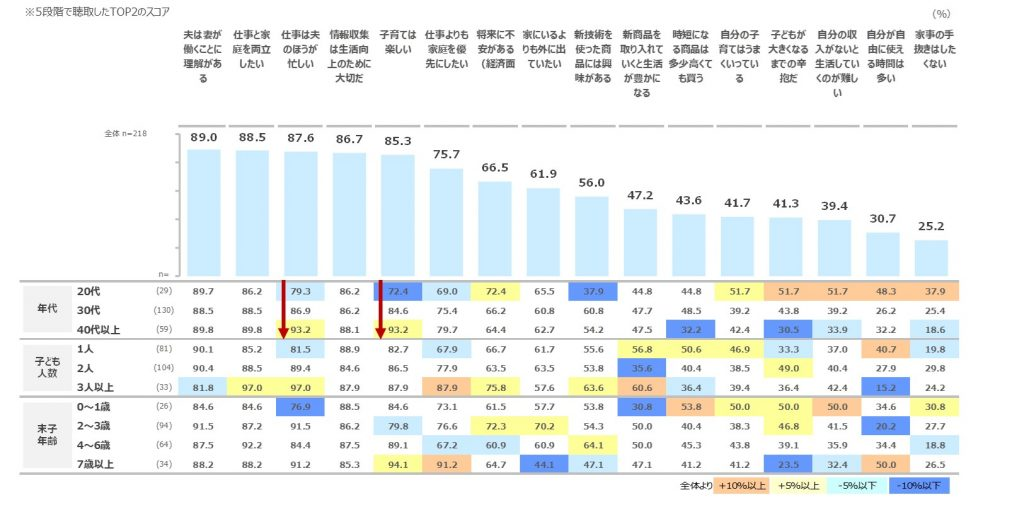 「夫は妻が働くことに理解がある」「仕事と家庭を両立したい」「仕事は夫のほうが忙しい」がトップ3。「子育ては楽しい」も多い。ママスクママの多くは『パートナー理解があり仕事と家庭を両立したい子育てエンジョイママ』。