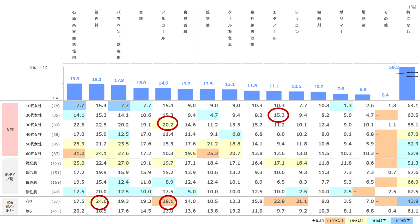 ■全体的に、年代が上がるにつれて「入っていないか必ず確認する成分」が増える傾向にありました。若い世代では、20代は「エタノール」が全体と比較して+4.2pts、30代は「アルコール」+5.6ptsが多い結果です。アレルギー「有り」は「無し」より確認する成分が多い傾向にあり、「石油系界面活性剤」17.5%よりも、「アルコール」28.1%、「着色料」24.6%を確認している。